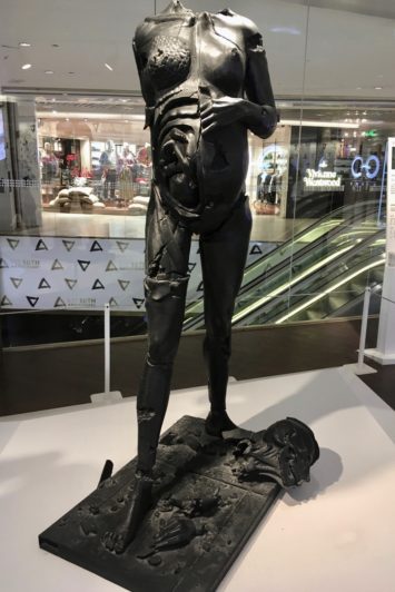 Det finns ytterligare utställningslokaler på andra våningar i K11, liksom enskilda konstverk utplacerade i trapphus och passager. Damien Hirsts skulptur ”Wretched War” (2004), inköpt 2012 för fyra miljoner kronor (ur en edition på tio exemplar), visar krigets offer, en gravid kvinna. Kroppen uppbruten, täckt av sår, huden avfläkt. Skulpturen står här för att… ja, kan det vara för något annat än att K11 i sin marknadsföring ska kunna säga att de har en Damien Hirst? Men kanske är det logiskt, symbiotiskt. Vem är mer marknadsanpassad än Damien Hirst? Tar vi hans skulptur på allvar är placeringen av ”Fördöma krig”, bland lyxbutiker och invid en restaurang, cynisk. När vi säger det till några yngre konstintresserade Shanghaibor håller de inte med. De trivs och tycker att konst och shopping utmärkt går hand i hand och försäkrar att K11 brukar ha bra utställningar – and that’s it.