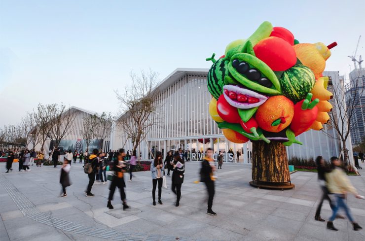 Utanför West Bund-mässan finns ett 18 meter högt frukt- och grönsaksträd av den sydkoreanske konstnären Choi Jeong Hwa, utfört i uppblåsbar polystyren (se bild ovan). Ovanför entrén till en av hallarna svävar fem voluminösa plastblommor i starka färger. Vilken är meningen?