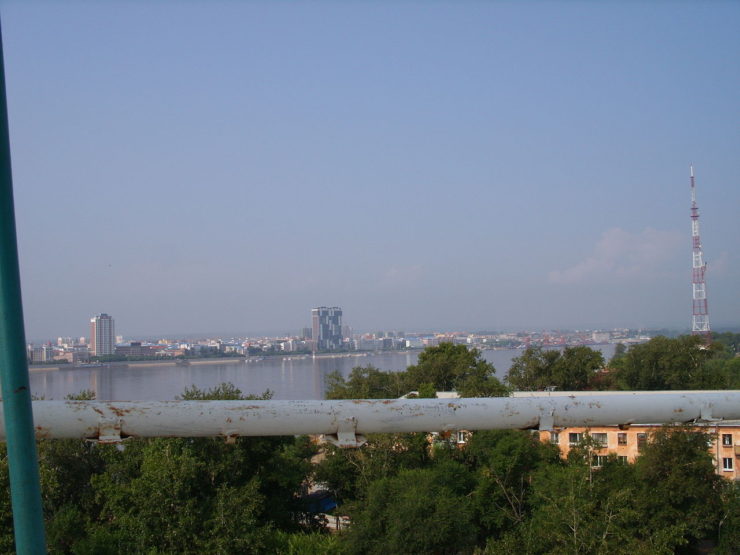 På andra sidan Amurfloden ligger den ryska staden Blagovesjtjensk. Det är den 9 maj, kallad segerdagen, när Ryssland firar andra världskrigets slut med prakt och flärd. Från den kinesiska sidan ser man ett vackert ryskt fyrverkeri efter solnedgången. Det är lågvatten i floden och bara 300 meter mellan städerna. Hela dagen har man kunnat se ett stort folkliv på den ryska sidan. Man ser karuseller, en stor rysk fana som vajar friskt på ett torg, folk som strosar på gatan längs stranden.